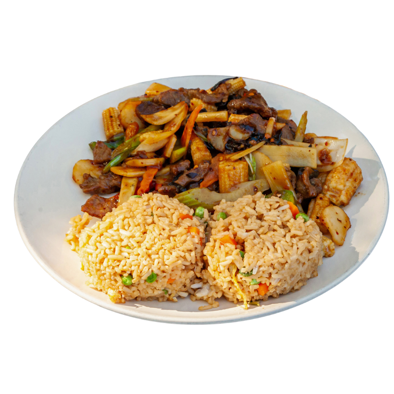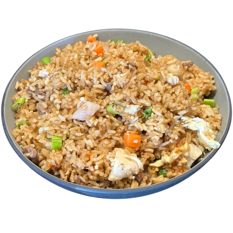 Peas, Carrots, Green Onions, Eggs, & Bean Sprouts mixed in with your choice of protein.