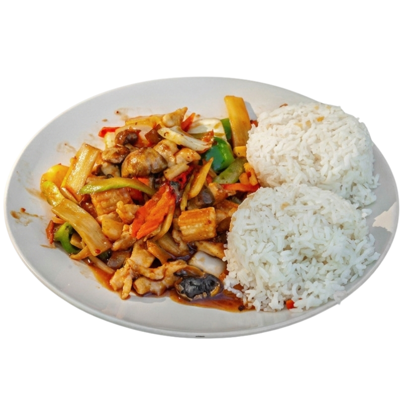 Your choice of protein sauteed with broccoli, carrots, celery, Chinese cabbage, mushrooms, and water chestnuts.