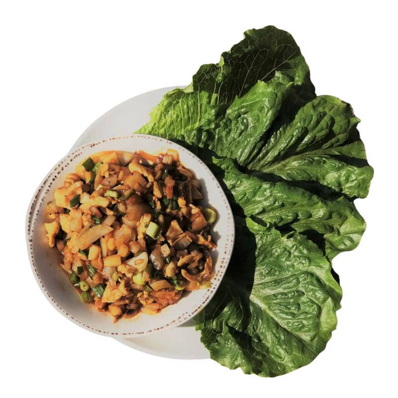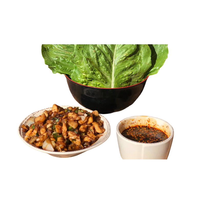 Wok-seared chicken, minced green onions, yellow onions, & water chestnuts, served with crisp lettuce cups